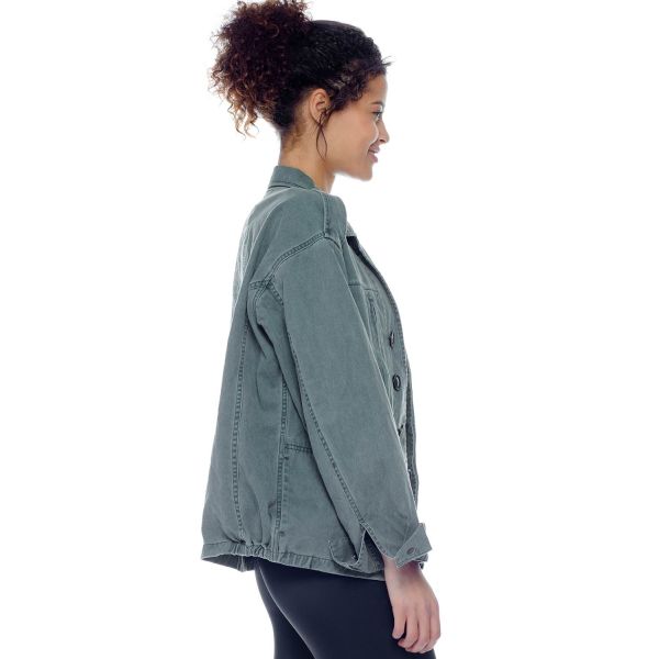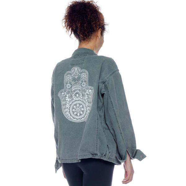 The universe has your back. Our perfectly faded army jacket is back for spring with a henna Hamsa back and ‘Karma’ front graphic.