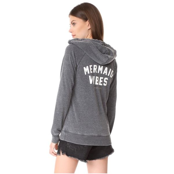 Make waves in the perfect summer zip hoodie featuring a rainbow peace patch and ‘Mermaid Vibes’ back graphic. Made from a super soft fleece jersey blend in a sun-faded vintage black. Polyester/Cotton/Viscose.